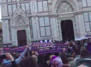 FIRENZE – In migliaia, con sciarpe viola al collo e bandiera della Fiorentina in mano, stamani si son radunati in piazza santa Croce per l’ultimo simbolico saluto al capitano della Fiorentina morto domenica scorsa a 31 anni per arresto cardiocircolatorio dovuto a cause naturali.