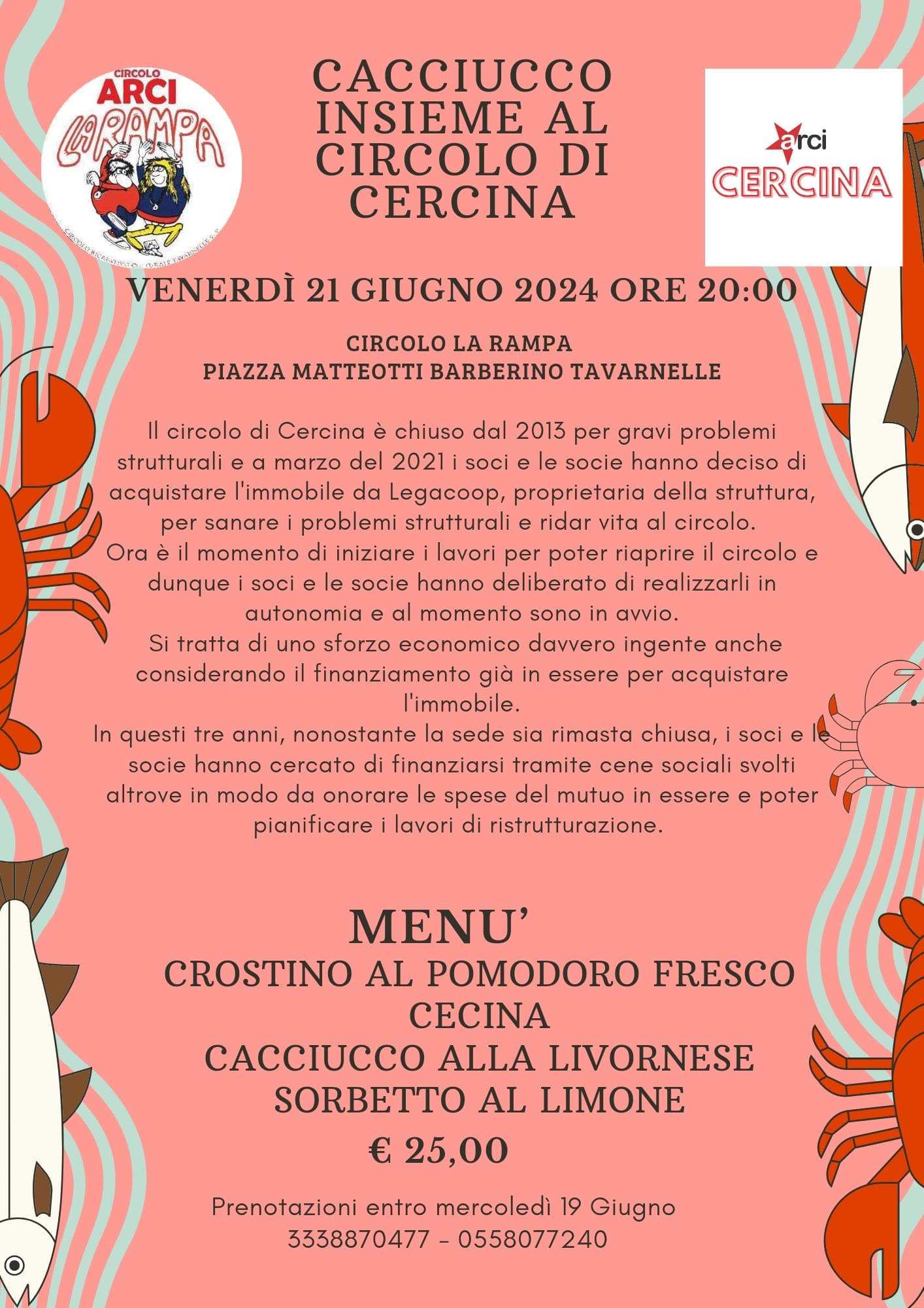 FIRENZE – Appuntamento venerdì 21 giugno al Circolo Arci La Rampa di Tavarnelle per una cena a base di cacciucco fatto dai volontari del circolo Arci di Cercina: il ricavato sarà destinato proprio a quel circolo.