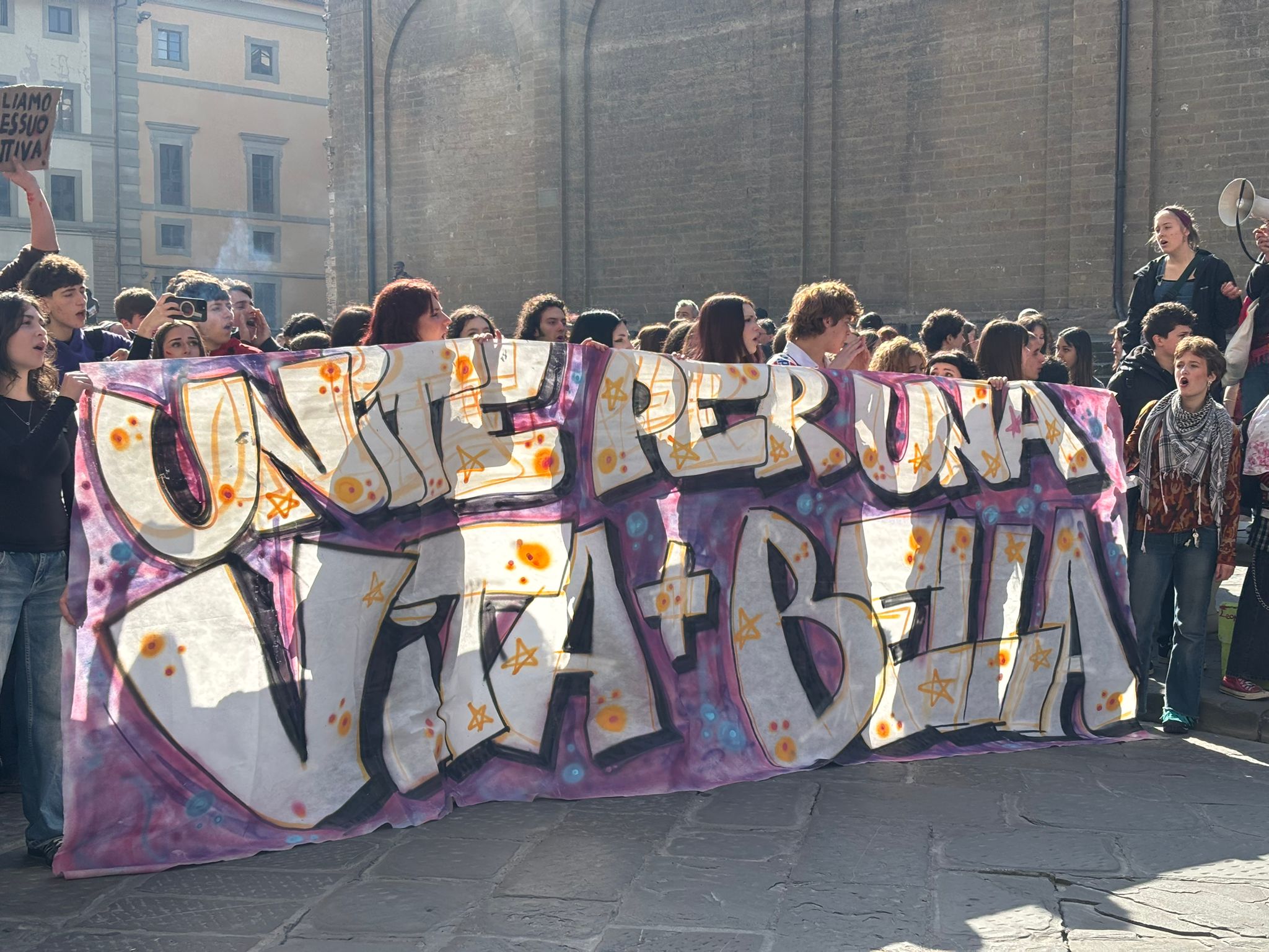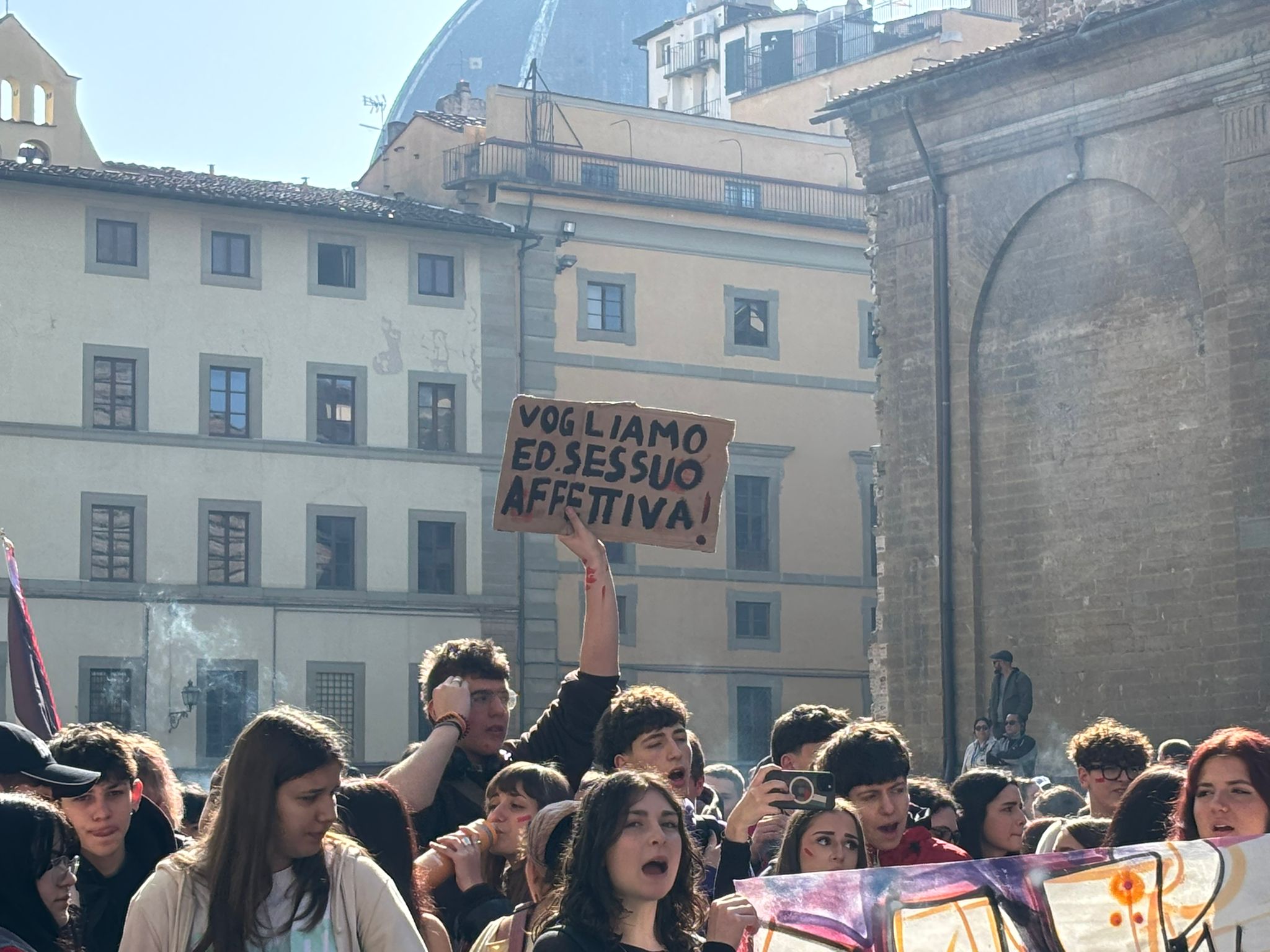 In piazza tanti ragazzi, tra cui quelli dei collettivi studenteschi che rivendicano la possibilità di introdurre corsi di educazione sessuo-affettiva nelle attività didattiche.