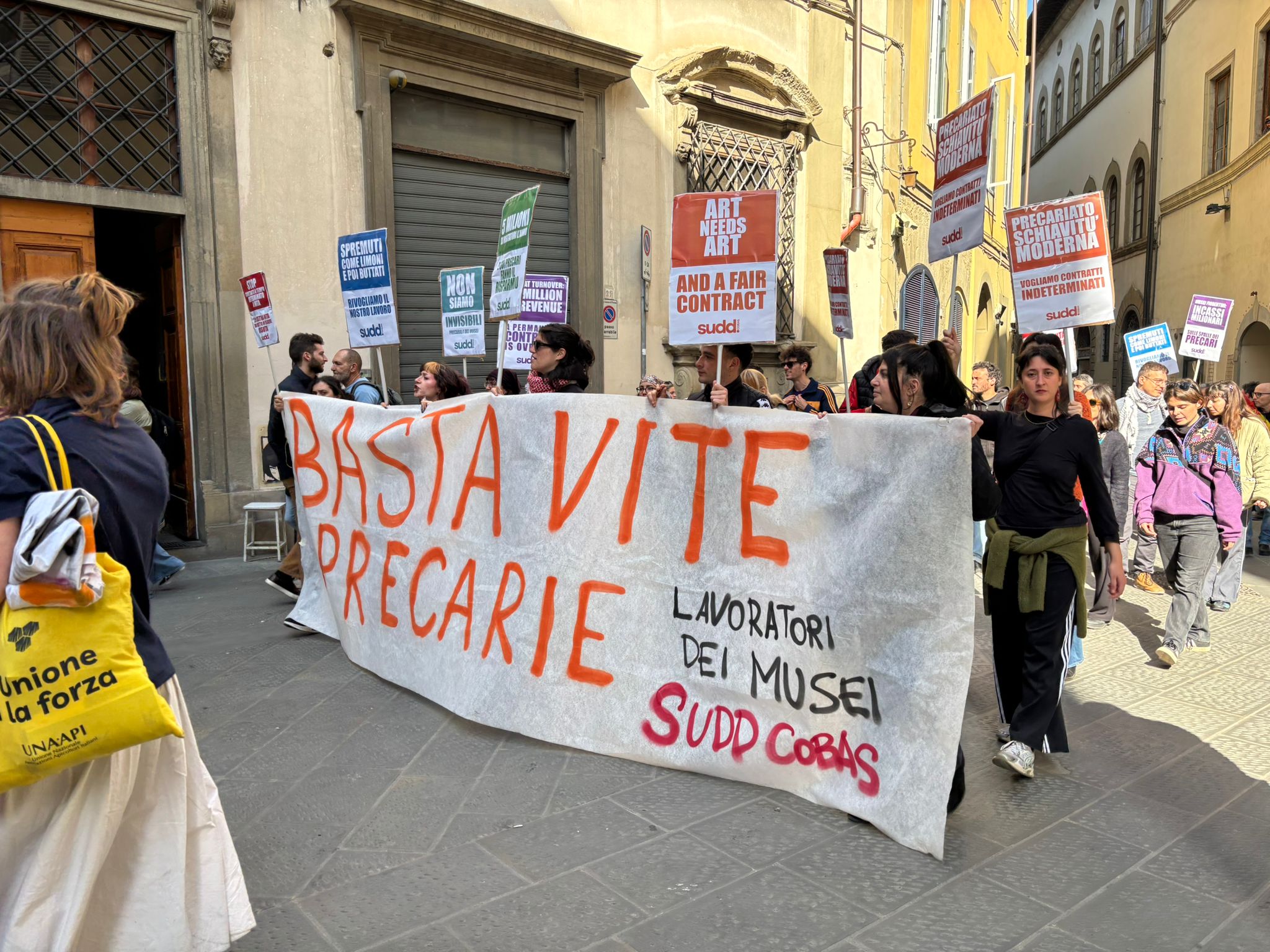 In piazza anche i lavoratori precari dei musei fiorentini sostenuti dal sindacato Sudd Cobas, che con lo striscione “Basta vite precarie” ricordano che la parità dei diritti di conquista anche sul fronte del lavoro stabile e del gap salariale tra donne e uomini.