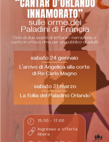 - FIRENZE - Un ciclo di due eventi di lettura, narrazione e canto in ottava rima. Si intitola "Cantando Orlando innamorato sulle orme dei Paladini di Francia" il doppio appuntamento in programma rispettivamente il 24 gennaio e il 21 di marzo a Garage P Studio a Firenze di e con Michele Neri. Si parte questo sabato alle 15:30 con "L' arrivo di Angelica alla Corte di Re Carlo Magno". L'obiettivo di questi eventi è raccontare le storie cavalleresche attraverso il […]