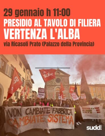 - PRATO - E’ fissato per giovedì prossimo, 29 gennaio, nella sede della Provincia di Prato l’atteso tavolo istituzionale per la vertenza dei lavoratori della stireria “L’alba” di Montemurlo: dopo 4 mesi senza stipendio, fatti di mobilitazioni, scioperi, aggressioni subite dai picchetti operai, presidi davanti alle vetrine delle “griffe” che vendono i prodotti confezionati grazie al lavoro de “L’Alba”, si capirà se l’azienda e i grandi marchi committenti saranno disposti a mostrare quello scatto di “responsabilità sociale“ che lavoratori e […]