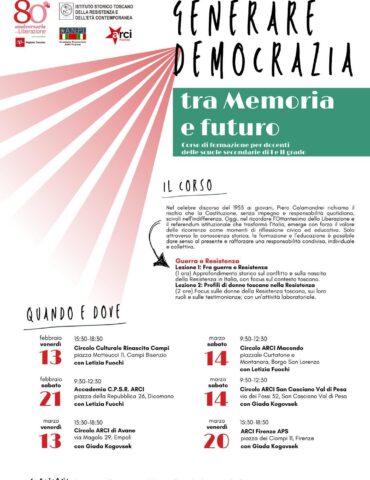 - FIRENZE - Diffondere sempre di più la conoscenza della storia della Resistenza ma anche la consapevolezza dei diritti conquistati con la Liberazione e l'approvazione della Costituzione che quest'anno compie 80 anni. E' l'obiettivo del progetto "Generare Democrazia - tra memoria e futuro", promossa da ARCI Firenze, Anpi Firenze, Istituto Storico della Resistenza e dell'età contemporanea eh in Toscana: un ciclo di sei incontri, ciascuno di 3 ore, in altrettanti circoli ARCI della Provincia di Firenze, durante i quali le […]
