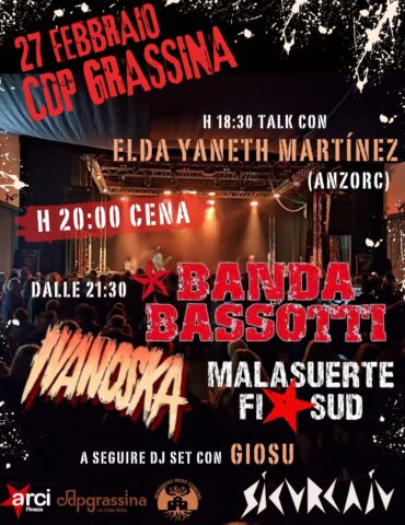 + FIRENZE - Una serata all'insegna della condivisione, partecipazione e musica dal vivo. Venerdì 27 febbraio alle 21.30 sul palco del Sicurcaiv alla Casa del Popolo di Grassina il concerto di Banda Bassotti, Ivanoska e Malasuerte Fi Sud, inserito in una serata che parte già alle 18.30 con un talk con Elda Yaneth Martinez, presidente di Anzorc, collettivo di donne colombiane che lottano per il riconoscimento della propria libertà a coltivare, vendere ed esportare i prodotti agricoli coltivati nelle riserve […]