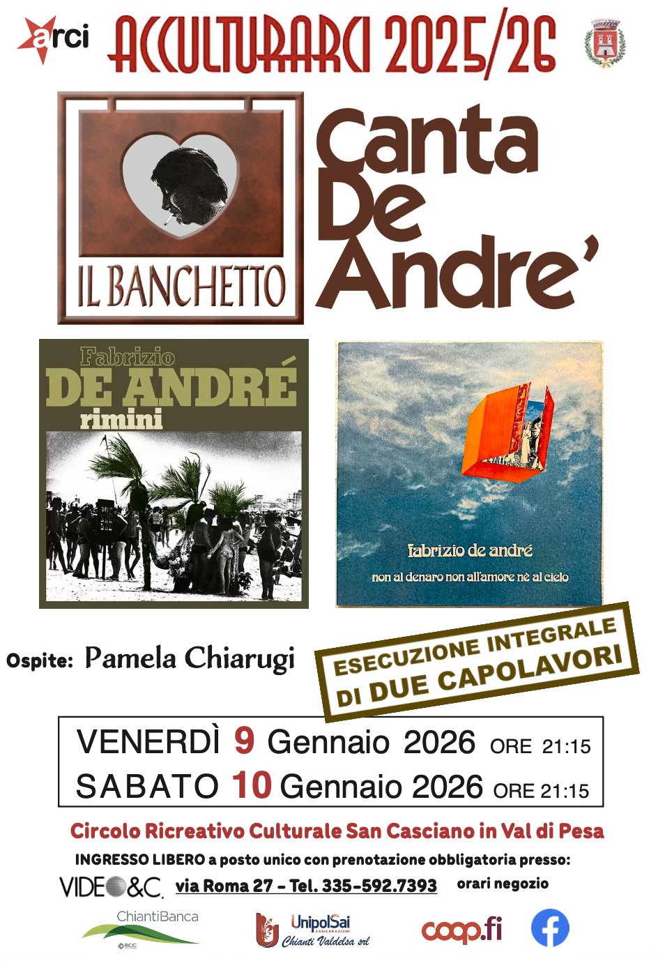- FIRENZE - Prosegue la rassegna Acculturarci organizzata dal Circolo Arci di San Casciano in Val di Pesa. Come ogni anno a gennaio non può mancare l'appuntamento dedicato a Fabrizio De André che quest'anno è doppio. Venerdì 9 e sabato 10 gennaio alle 21.15 il Banchetto suonerà due capolavori del cantautore genovese: Rimini e Non al denaro non all’amore né al cielo. Ospite Pamela Chiarugi. Ingresso libero, posto unico con […]