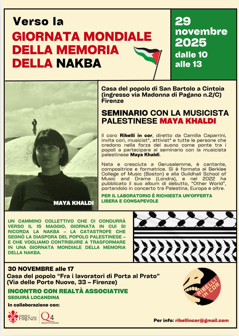 - FIRENZE - Doppio appuntamento sabato 29 e domenica 30 novembre per mostrare solidarietà al popolo palestinese e per chiedere l'istituzione della giornata mondiale della memoria della Nakba". Sabato 29 Ribelli in cor organizza un seminario mattutino alla casa del popolo di San Bartolo a Cintoia con la musicista palestinese Maya Khaldi. Il 30 di novembre alla casa del popolo fra i lavoratori di Porta al Prato è in programma […]